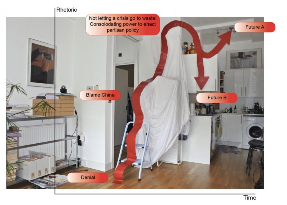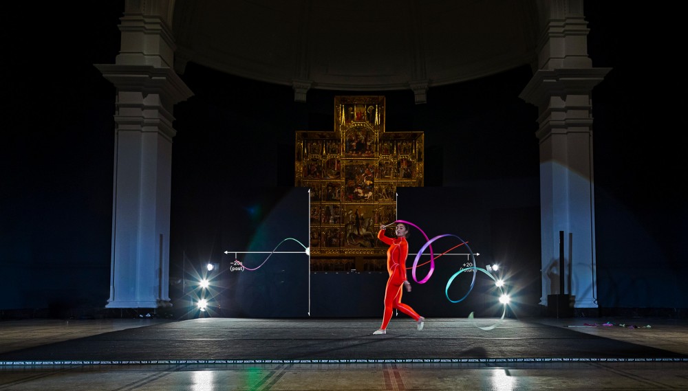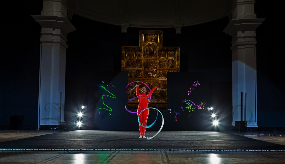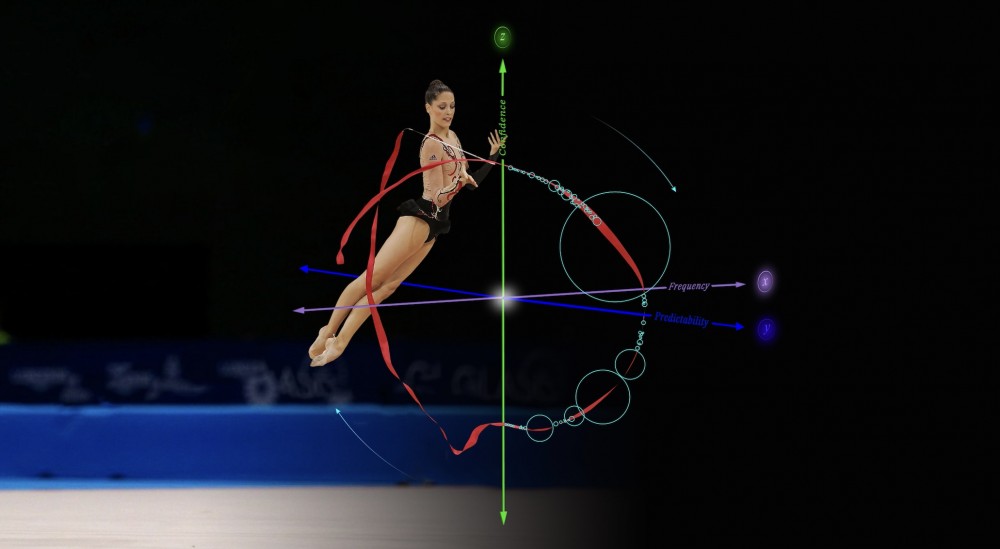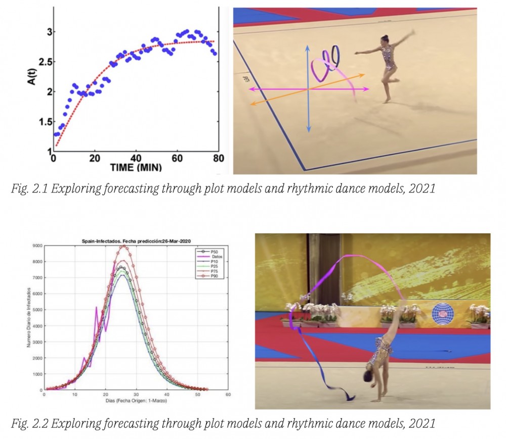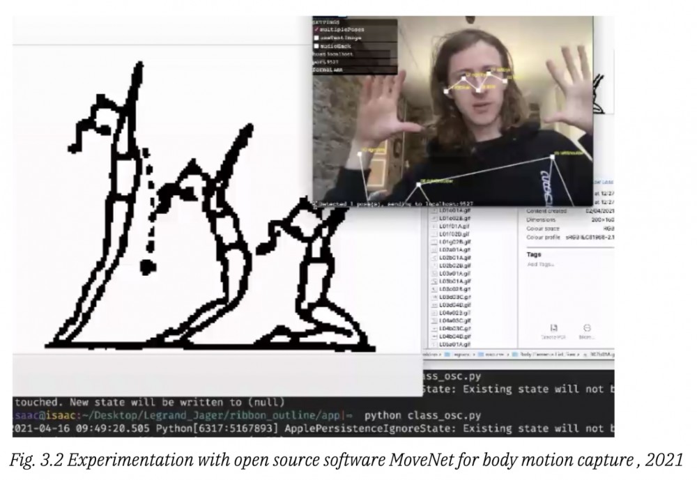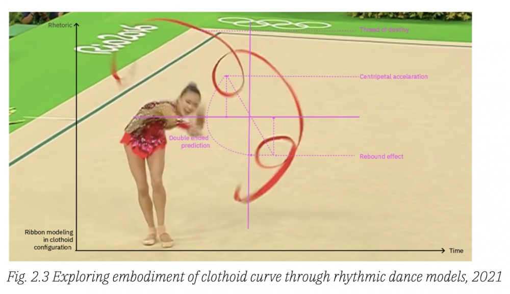 The ribbon.Py programme—developed in collaboration with Isaac Clarke—reveals the logic employed by computer vision and computational prediction as the gymnast performs. Here, performance becomes a way of generating data and diagramming the logic behind models used to forecast so much about our lives, from the COVID-19 pandemic to climate change.